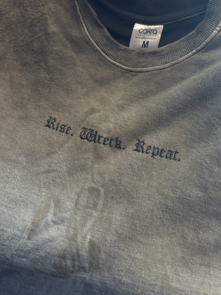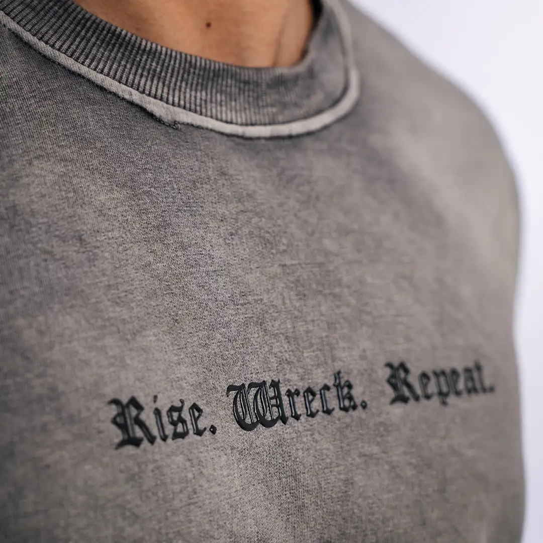 On the chest, “Rise. Wreck. Repeat.” is printed in a shiny high-density silicon print—raised, glossy, and built to stand out. It’s got that clean 3D effect that adds depth without overdoing it.